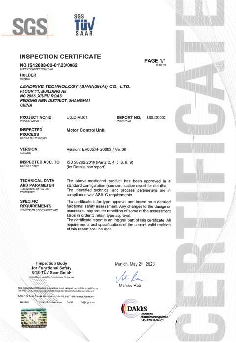 臻驅科技于2022年5月中旬啟動該電機控制器研發項目,圍繞需求定義、安全概念、系統架構設計、安全分析、軟硬件詳細設計、測試驗證、生產交付等全生命周期,建立了一套完整的功能安全開發與管理工具鏈,歷時1年產出項目文件300余份,并于2023年5月通過權威第三方審核,取得了ISO 26262功能安全ASIL C產品認證證書。
